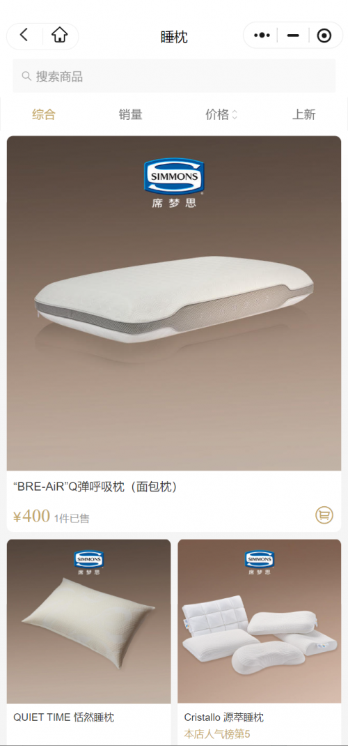 “Simmons席梦思美眠商城”小程序的核心是为消费者便捷提供适配床垫的正品睡枕、床品以及吉祥物Zalmon 摘梦®和 Dreamon 梦宝周边等产品,完善全方位美眠体验。睡枕更有QUIET TIME 恬然睡枕、“BRE-AiR”Q弹呼吸枕、Cristallo源萃睡枕等多种系列,其中:“BRE-AiR”Q弹呼吸枕,采用高透气呼吸绵,96%开孔率搭配全枕面透气槽,散热气防闷汗,且支持全枕水洗;Cristallo源萃睡枕系列,融入Biocrystal粉末(多种自然元素)的记忆绵贴合人体曲线,支撑好,睡感好,适配多睡姿,避免晨起肩颈酸痛。同时还有Dreamon梦宝睡枕、新风枕等多个睡枕系列,均有福利套餐,配适多种不同人群需求。