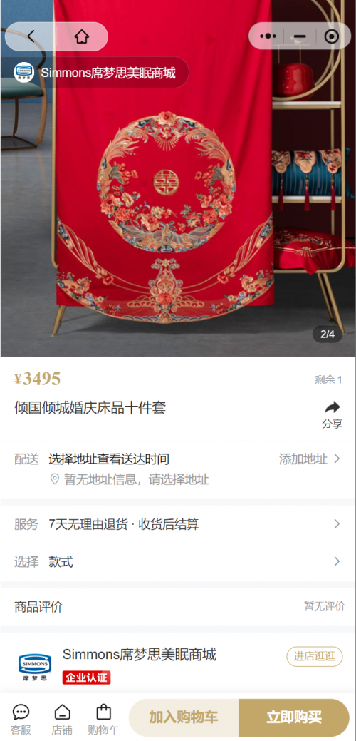 除了正品保障,“Simmons®席梦思美眠商城”小程序还以“便捷化”“人性化”的服务,降低消费者的选购门槛。消费者完成注册后进入小程序,商品详情页清晰标注材质、尺寸、适用场景等关键信息,帮助消费者精准判断是否适配自身需求;选定商品后,可直接点击“立即购买”完成支付,或加入购物车统筹下单,整个流程无需跳转外部平台,既节省时间,又保障交易安全。