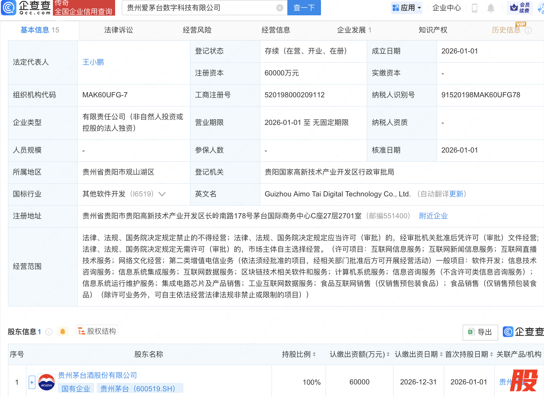 近日,贵州爱茅台数字科技有限公司成立,注册资本6亿元,经营范围包含:互联网直播技术服务;区块链技术相关软件和服务;集成电路芯片及产品销售;工业互联网数据服务等。企查查股权穿透显示,该公司由贵州茅台(600519)全资持股。